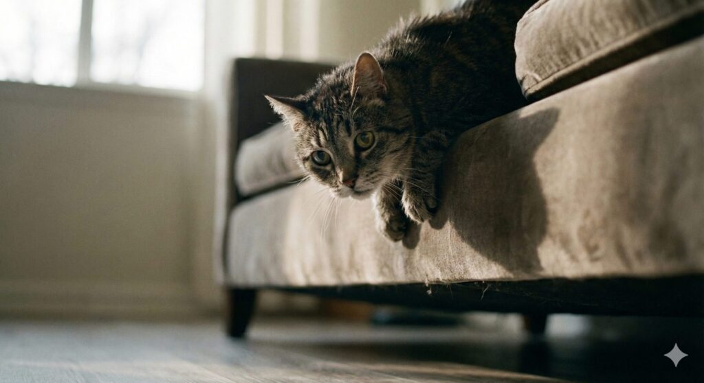 猫は野生の本能で、ギリギリまで痛みを隠します。「痛い」と鳴くことは稀で、代わりに「ジャンプを失敗する」「高い場所に登らなくなる」「動きがゆっくりになる」といった行動の変化でサインを出します。