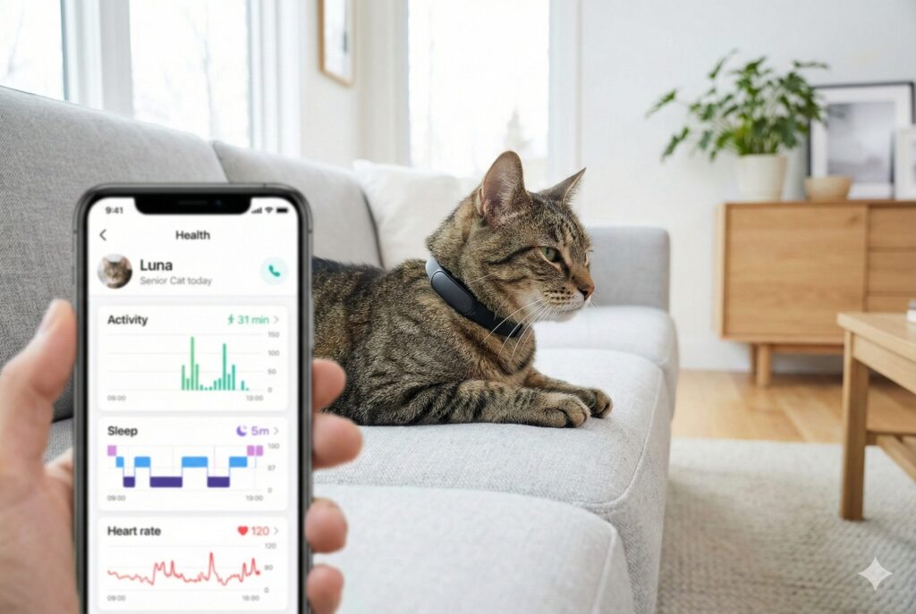 私が実際に17歳の愛猫に使っているのは、首輪型のデバイス(Catlog)と見守りカメラの併用です。 Catlogで「活動量・食事・水飲み」のデータを自動記録し、異常値のアラートが来たらカメラで様子を確認する。この体制を作ってから、外出中の不安が激減しました。