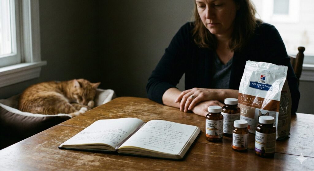 私は、嫌がる治療を最小限に減らすことにしました。 栄養バランスの良い療法食ではなく、彼が昔から大好きだった(でも腎臓にはあまり良くない)カツオのおやつをトッピングしました。 すると彼は、久しぶりに目を輝かせて完食し、満足げに喉を鳴らして私の膝に乗ってきました。